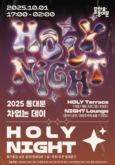 서울 동대문구는 오는 10월 1일 오후 5시부터 다음날 오전 2시까지 회기역 인근 회기랑길(경희대로1길 및 경희대로1가길 일대)에서 ‘2025 차없는 데이-HOLY NIGHT’ 행사를 개최한다고 밝혔다.