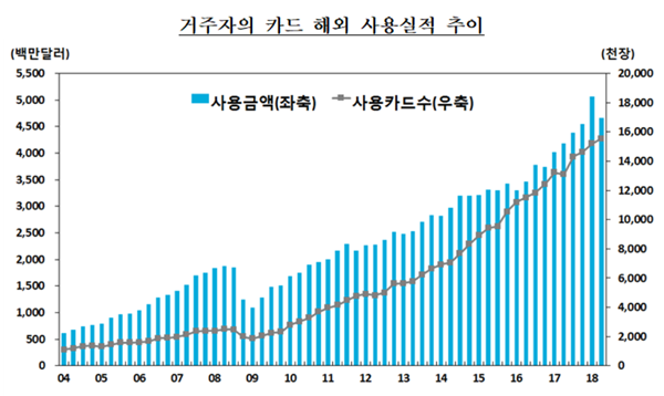 상반기로 보면 해외 카드 사용 금액이 97억4000만 달러로, 전년 동기 대비 18.7% 증가했다.