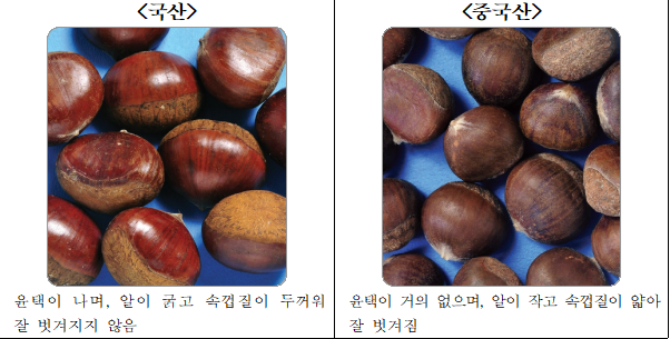 ② [밤] 국산은 알이 굵고 윤택이 많이 나면서 속껍질이 두꺼워 잘 벗겨지지 않으나, 중국산은 알이 작고 윤택이 거의 없으며, 속껍질이 얇아 잘 벗겨지는 것이 특징이다.