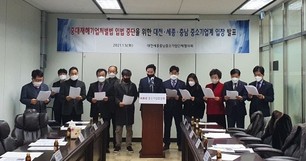 이와 함께 오승균 대전세종충남플라스틱협동조합 이사장, 박영국 대전세종충남인쇄정보산업협동조합 이사장, 조형수 대전세종충남기계공업협동조합 이사장 등 업종별 중소기업협동조합대표가 함께 자리해 현재 국회에서 추진되고 있는 중대재해기업처벌법에 대한 심각한 우려를 표하며 제정을 중단해 줄 것을 호소했다.