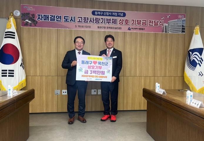 이날 부산 동래구 신청사 개청 행사에서 열린 기부금 전달식을 통해 옥천군은 동래구에, 동래구는 옥천군에 각각 고향사랑기부금 300만 원을 기부하며 제도 활성화와 지역 발전을 응원했다.
