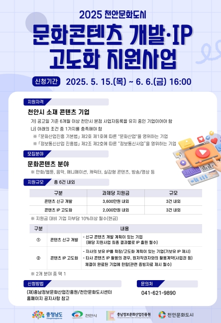 (재)충남정보문화산업진흥원은 오는 6월 6일까지 ‘2025 천안문화도시 문화콘텐츠 개발·IP고도화 지원사업’ 참가기업을 모집한다고 밝혔다.
