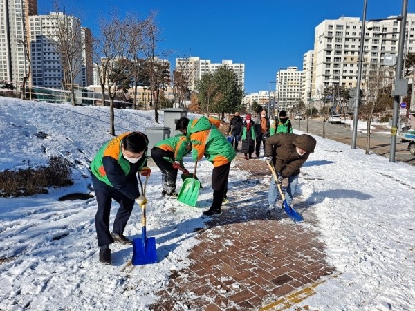 이날 제설 작업은 지난 6일 저녁부터 7일 오전까지 세종시 전역에 평균 7㎝에 가까운 눈이 내리면서 한솔동 지역 내 보행 안전을 위협하는 눈을 치우기 위해 이뤄졌다.