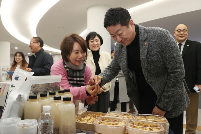 김 의장은 행사장 내 마련된 기관별 판매 부스를 일일이 찾아 연근강정, 커피, 호두정과, 참기름, 전통과자 등의 각종 생산품을 직접 구매하면서 관계자들을 격려하고 응원했다.