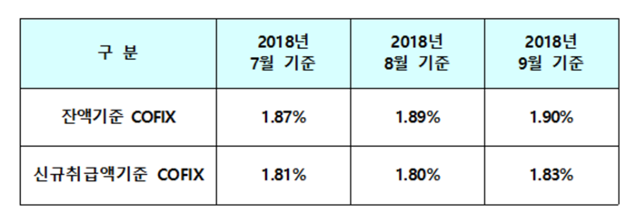 은행연합회는 9월 코픽스가 잔액 기준 1.90%로 전월 대비 0.01%포인트, 신규취급액 기준은 1.83%로 0.03%포인트 상승했다고 15일 공시했다.