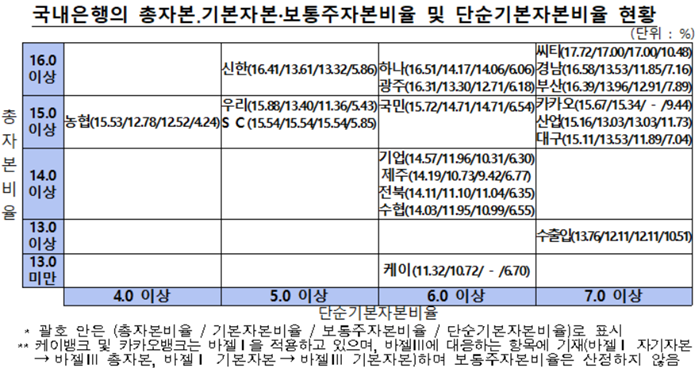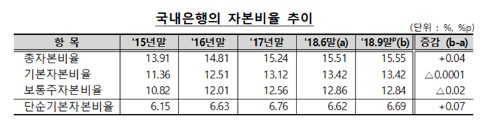 6일 금융감독원에 따르면 국내 은행들의 올해 3분기 말 BIS 기준 총자본비율은 15.55%다. 총자본비율과 단순기본자본비율은 각각 0.04%포인트, 0.07%포인트 상승했으며, 기본자본비율(+0.0001%포인트)과 보통주자본비율(+0.02%포인트)은 전 분기와 유사한 수준인 것으로 나타났다.은행별로는 씨티(17.72%), 경남(16.58%)의 총자본비율이 높은 편이었고 케이뱅크(11.32%), 수출입은행(13.76%)은 상대적으로 낮았다.