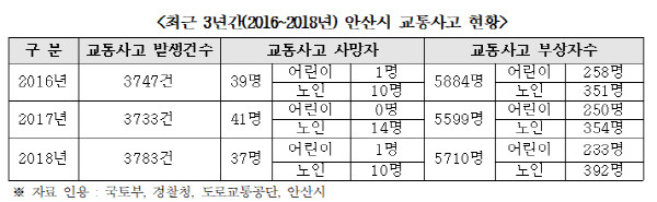 안산시는 인구가 매년 감소하면서도 자동차 등록대수는 2018년 기준 29만 7천 여 대로 꾸준히 증가하고 있다. 안산시 최근 3년간(2016~2018년) 교통사고 현황을 보면, 교통사고 발생건수는 지난 2016년 3747건에 비해 2018년에는 오히려 3783건으로 증가했다.