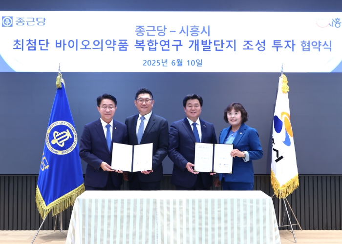 시흥시는 10일, 서울 종근당 본사에서 경기도, 종근당과 함께 최첨단 바이오의약품 복합연구개발단지 조성을 위한 투자양해각서를 체결했다. 지난 2월 경기경제자유구역 배곧지구 연구3-1용지의 우선협상대상자로 종근당을 선정하고, 약 4개월간의 협상을 거쳐 이뤄낸 결과다.