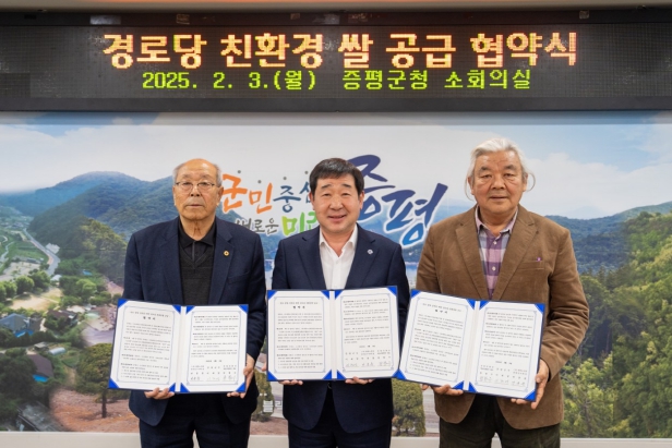 충북 증평군이 3일 군청 소회의실에서 (사)대한노인회증평군지회, 증평친환경영농조합법인과 지역 내 경로당 친환경 쌀 공급을 위한 협약을 체결했다.
