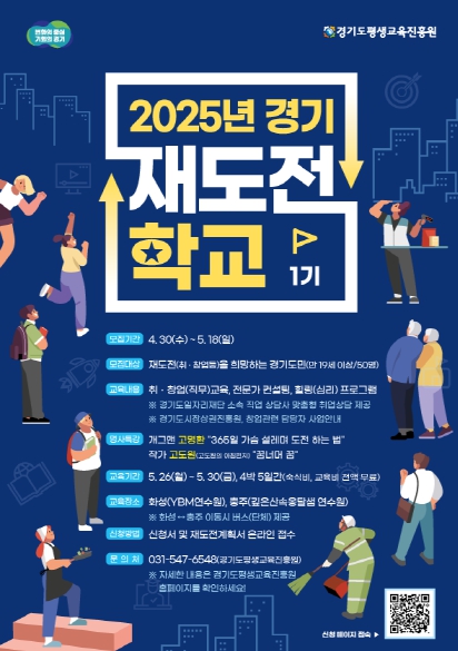 ‘경기재도전학교’는 취업 또는 창업 과정에서 실패를 경험한 도민을 대상으로 실패 원인 분석, 심리 치유, 동기 부여, 직무 실습 등을 통해 재도전을 지원하는 교육 프로그램이다.