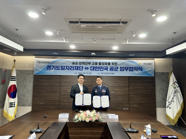 경기도일자리재단은 7일 대한민국 공군과 ‘전역간부 취업지원을 위한 업무협약’을 체결하고, 공군 전역간부(전역예정자 포함)의 원활한 사회 복귀와 성공적인 취업 지원을 위해 협력하기로 했다.