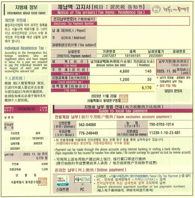 이에 동대문구는 한국어와 함께 영어·중국어를 병기한 체납 안내문을 제작했다. 안내문 앞면은 기존 체납고지서 형식을 유지하면서 주요 은행(신한·우리·농협) 전용계좌를 명시해 납부 편의를 높였다. 뒷면에는 체납 시 불이익 내용을 한국어·영어·중국어·베트남어 4개 언어로 안내해 외국인도 쉽게 이해할 수 있도록 했다.