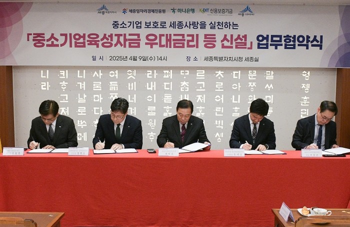 시는 9일 시청 세종실에서 하나은행, 신용보증기금, 세종신용보증재단, 세종일자리경제진흥원과 ‘세종시 경영안정자금 우대금리 등 신설 업무협약’을 체결했다.