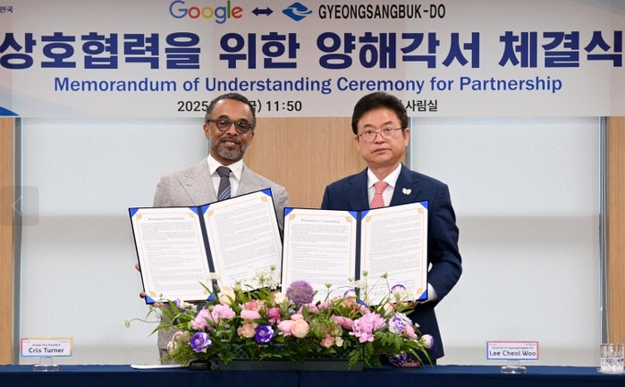 경상북도와 구글은 9일 도청에서 이철우 도지사, 양금희 경제부지사, 크리스 터너 구글 글로벌 부사장, 황성혜 구글코리아 부사장 등이 참석한 가운데 ‘상호협력체계 구축을 위한 양해각서 체결식’을 개최하고, 앞으로 지속적인 파트너십 구축에 합의했다.