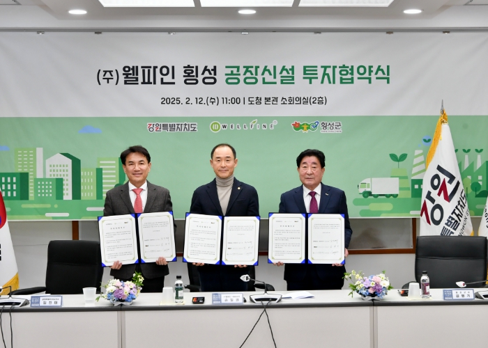 횡성군과 강원도, ㈜웰파인이 12일 11시 강원도청 본관 소회의실에서 협약식을 열고 횡성 제2공장 신설을 약속했다.