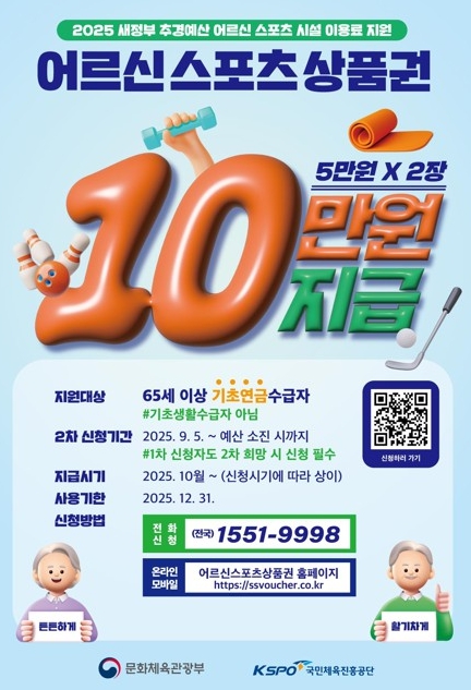 65세 이상 기초연금 수령 주민에게 1인당 5만 원 상당의 스포츠 상품권(모바일 상품권)을 2장씩 총 10만 원을 지급한다.