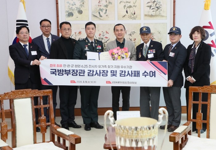 강원특별자치도는 국방부 유해발굴감식단이 추진한 ‘2025년 민·관·군 협업 6·25전사자 유가족 집중 찾기’ 사업에서 전국 최초 민관군 협업 6.25전사자 유가족 찾기 지원 우수기관으로 선정돼, 3월 9일 국방부장관으로부터 감사장과 감사패를 수상했다고 밝혔다.