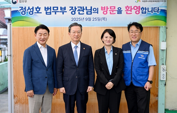 ▲ 김동근 시장이 9월 25일 의정부시희망회복종합지원센터를 방문해 노숙인과 시설 종사자들을 위문한 뒤 정성호 법무부 장관, 박지혜 국회의원, 김충식 센터장과 함께 기념사진을 찍고 있다. |
