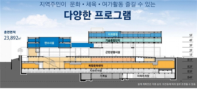 ○ 지하 3~4층에는 주차장이, 지하1~2층에는 수영장, 도서관, 다목적홀, 체육센터, 공연장, 상가 등 주민편의시설이 조성된다. 지상 1~2층에는 공연장과 상가, 사무실, 회의실이, 3층~4층에는 장애인 연수시설 및 기술종합단지가, 5층에는 장애인 치과병원이 각각 입지한다.