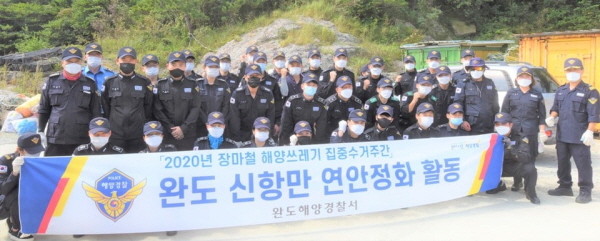 완도해경은 지난 28일 제 8호 태풍 ‘바비’의 영향으로 쓰레기가 유입된 신항만을 찾아 함정‧파출소‧경찰서 직원 등 45명이 참가해서 완도군 신항만을 찾아 쓰레기‧폐어망 수거 등의 해양정화 활동을 전개했다.