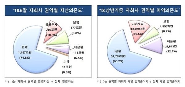 금융지주사의 6월 말 자산의존도는 금융투자가 전년 말 대비 상승(9.7%→10.5%) 하면서 다른 부문은 상대적으로 하락했다. 은행이 75.1%에서 74.6%로 하락했으며 보험(9.0% → 8.8%), 비은행(5.6% → 5.5%) 등이다.