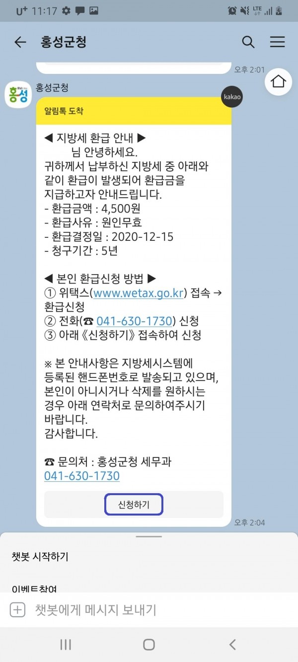 특히 군은 전국 지자체 최초로 찾아가는 환급서비스를 제공한다. 주민이 직접 세톡서비스를 신청해야 하는 타 지자체와 달리 홍성군은 환급 대상자를 직접 찾아 카카오톡을 통해 환급안내문을 전달하고 본인 인증과 계좌기입 등의 간단한 과정을 통해 신속하고 편리하게 환급을 받을 수 있도록 구축했다.