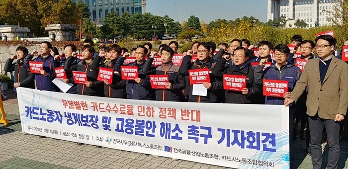 카드노조 측은 "9차례 카드수수료를 인하했지만, 소상공인들의 고통이 전혀 개선되지 않은 것은 정부 정책의 근본적인 방향성에 문제가 있다는 방증"이라며 "그럼에도 소상공인을 살리기 위한 대책이 오로지 카드 수수료 인하밖에 없는 것처럼 호도되고 있다"고 일갈했다.