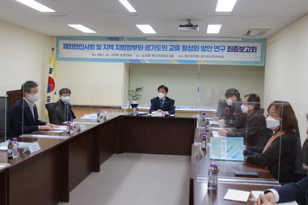 [프레스뉴스] 김대일 기자= 경기도의회 경기외교연구포럼 정희시 회장(더불어민주당, 군포2)은 25일 도의회 제1정담회실에서 “재외한인사회 및 지역지방정부와 경기도의 교류 활성화 방안 연구” 최종보고회를 가졌다.