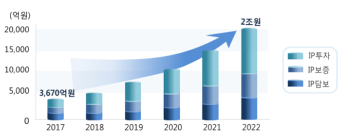 정부는 이번 대책을 통해 지난해 3679억원이었던 IP 금융 규모를 2022년에 2조원까지 늘린다는 목표다. 우수한 IP를 보유한 중소기업이 신용대출 대신 IP 담보대출을 받으면, 5년간 이자비용만 500억원 정도를 절감할 수 있을 것으로 보고 있다. 일자리 창출 효과도 5년간 1만여개에 이를 전망이다.