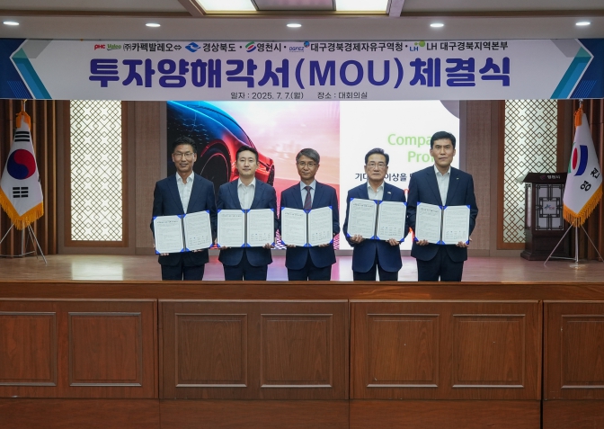 영천시는 7일 시청 대회의실에서 이남억 경상북도 공항투자본부장, 김병삼 대구경북경제자유구역청장, 신순철 ㈜카펙발레오 대표이사, 문희구 한국토지주택공사(LH) 대구경북지역본부장 등 관계자들이 참석한 가운데 투자양해각서(MOU)를 체결했다.