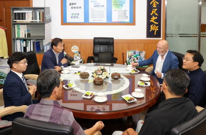 ▲ 진안홍삼, 화장품 산업 확장 가능성 모색(전춘성 진안군수와 움베르토 나르디 박사 등 관계자들 면담) |