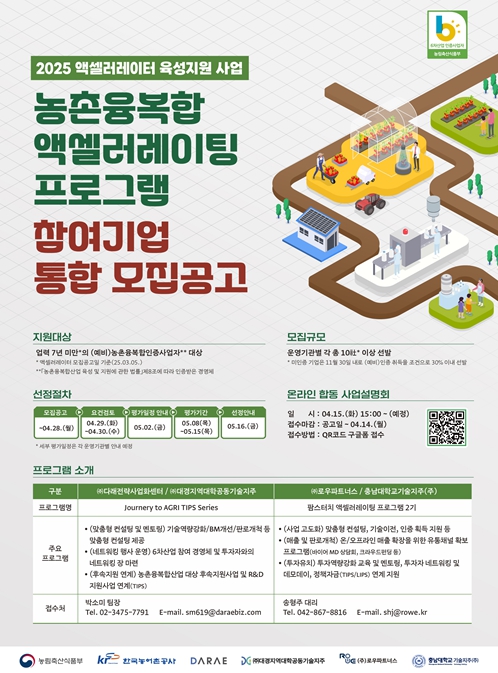 농림축산식품부는 창업 7년 미만 농촌융복합산업 (예비) 인증사업자를 대상으로 4월 9일부터 4월 28일까지 농촌융복합산업 액셀러레이팅 프로그램 참여기업을 모집한다.
