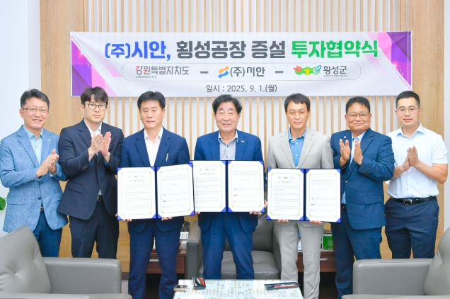 횡성군과 강원특별자치도는 1일 횡성군청에서 ㈜시안과 횡성공장 증설 투자협약을 체결했다.
