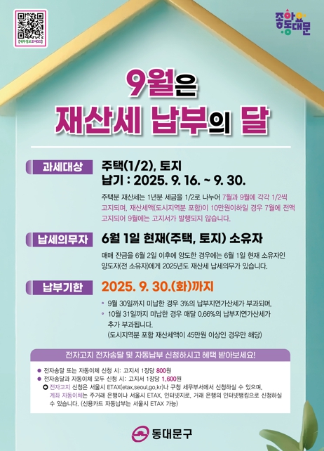 서울 동대문구는 9월 정기분 재산세를 납세의무자에게 부과‧고지했다고 16일 밝혔다.