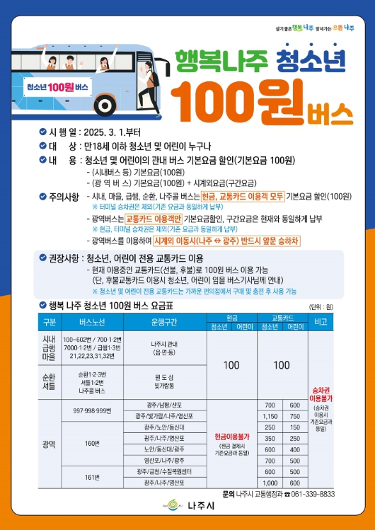 행복 나주 청소년 100원 버스 시행, 교통비 절감 및 대중교통 이용 활성화 기대