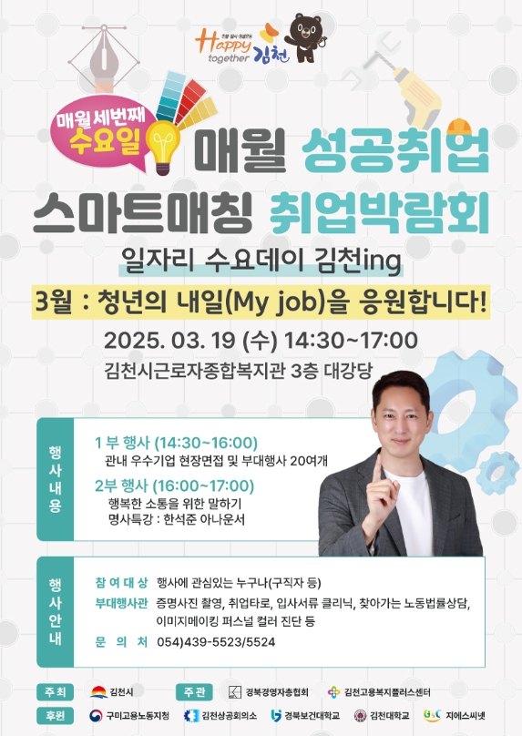 김천시는 오는 19일 오후 2시 30분, 김천시근로자종합복지관 3층 대강당에서 ‘2025 매월성공취업 스마트매칭 취업박람회’를 개최한다고 밝혔다.