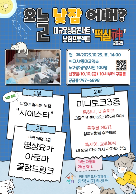 광양시가족센터는 오는 10월 25일 오후 2시, 중마교역소에서 광양시민과 함께하는 대규모 상담콘서트 ‘낮잠 프로젝트 떡실神’을 운영한다고 밝혔다.