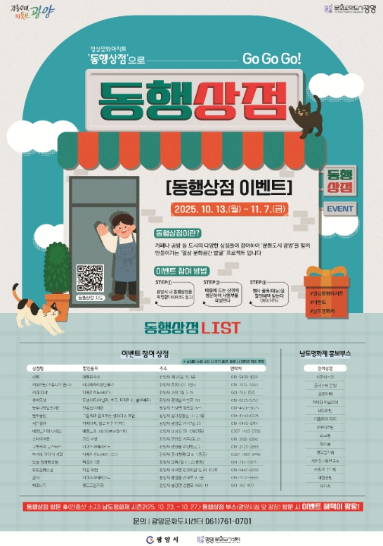 광양문화도시센터는 10월 13일부터 11월 7일까지 관내 ‘동행상점’ 15개소에서 시민 참여 이벤트를 진행한다고 밝혔다.