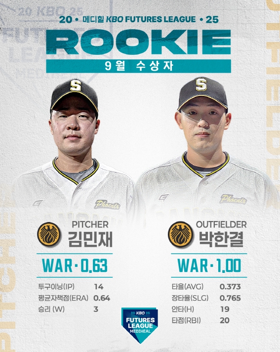 2025 메디힐 KBO 퓨처스리그의 9월 퓨처스 루키상 수상자로 투수 부문에는 상무 김민재가 WAR 0.63, 타자 부문에는 상무 박한결이 WAR 1.00을 기록하며 각각 선정됐다.
