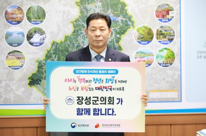 전남 장성군의회는 27일, 심민섭 의장이 ‘인구문제 인식개선 릴레이 캠페인’에 동참했다고 밝혔다.