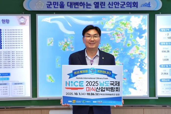 신안군의회 이상주 의장이 2025년 10월 1일부터 26일까지 목포문화예술회관 일원에서 열리는 ‘2025 남도국제미식산업박람회’의 성공적인 개최를 기원하는 릴레이 응원 캠페인에 동참했다.