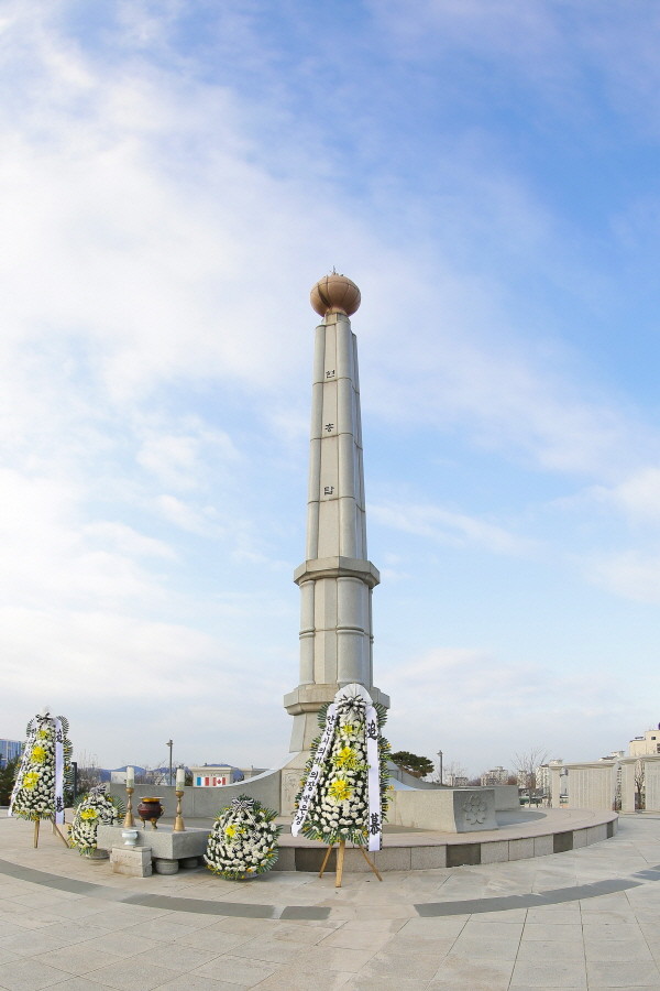 ▲ 사진 중간에 안산시의회 의장 화환과 원곡공원의 현충탑이 보인다. 박은경 의장이 참석한 이날 신년 현충탑 참배 행사는 코로나19 방역 지침을 철저히 준수한 가운데 약식으로 진행됐다. |