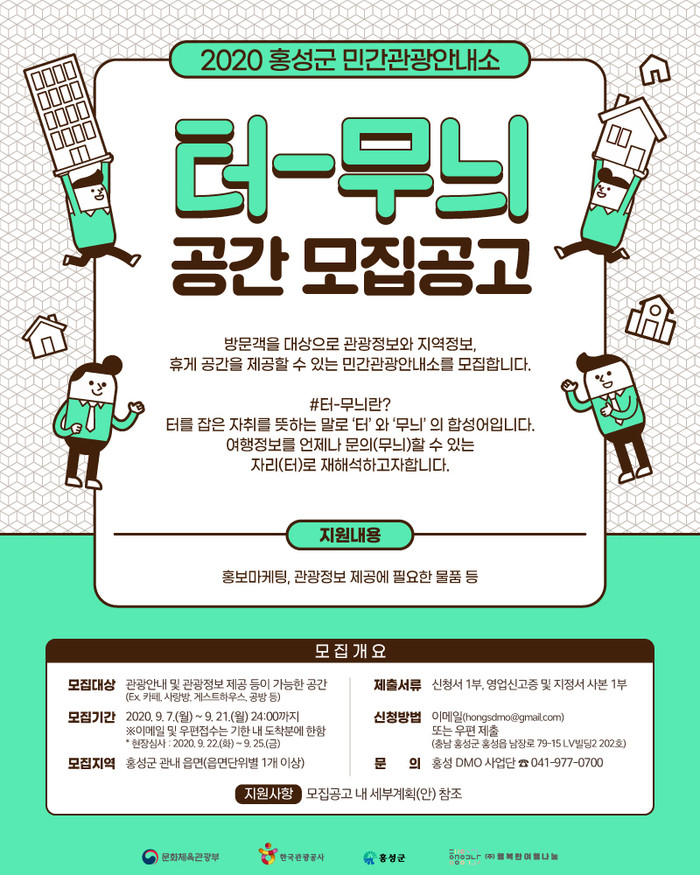 홍성군 거점관광 플랫폼 ‘터-무늬’와 관련된 자세한 사항은 홍성 DMO 추진단으로 문의하면 된다.