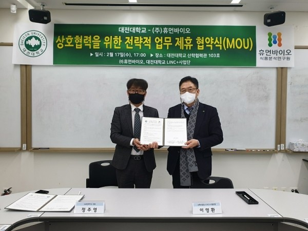 [프레스뉴스] 최정현 기자= 대전대학교는 이 대학 LINC+사업단(산학부총장 겸 단장 이영환)이 17일 대학 산학협력관에서 ㈜휴먼바이오(대표 정주영)와 업무협약(MOU)을 체결했다고 18일 밝혔다.