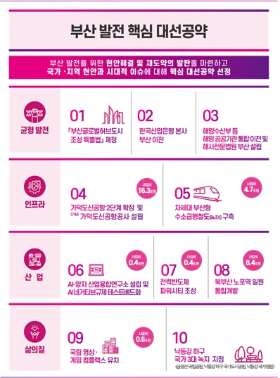 특히, 시는 글로벌 해양 경쟁력 강화와 실질적인 남부권 국가 성장축 조성의 단초 마련을 위해 '해수부 등 해양 공공기관 통합 이전'과 '부산·경남 행정통합'을 공약과제에 추가로 담아 대응하고 있다.