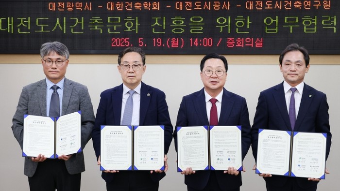 시는 5월 19일 시청 중회의실에서 (사)대한건축학회, 대전도시공사, (사)대전도시건축연구원(대전건축사협회·건축가협회·건축학회 연합)과 함께 ‘대전 도시건축문화 진흥을 위한 업무협약(MOU)’을 체결했다.