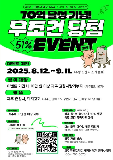 제주특별자치도는 고향사랑기부금 누적 70억 원 달성을 기념해 ‘51% 무조건 당첨 이벤트’를 진행한다.