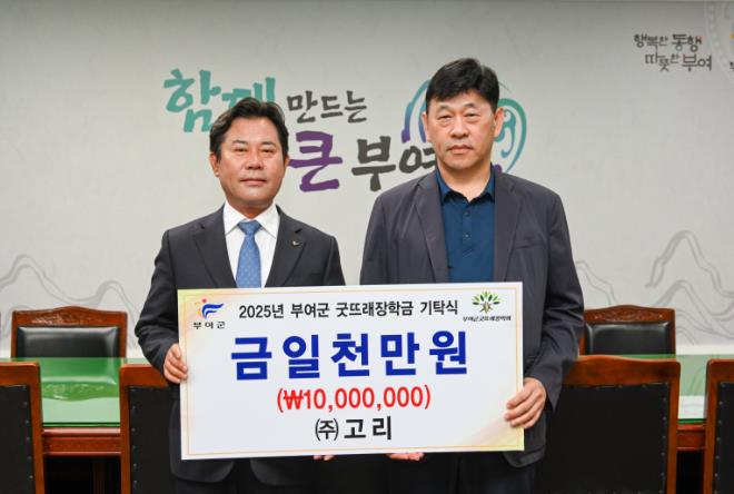 ㈜고리는 9일 부여군청을 방문해 인재 육성을 위한 장학금 1천만 원을 (재)부여군굿뜨래장학회에 기탁했다.