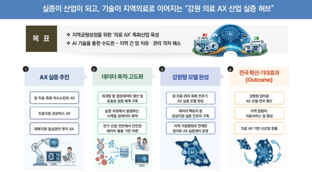 ‘강원 의료 AX 산업 실증 허브 조성 사업’은 암 치료를 돕는 AI 기반 의료서비스를 개발해 병원을 통해 즉시 실증하며, 희귀암 등 고부가가치 암 데이터의 생산 및 산업적 활용을 통해 ‘AI 기반의 암 치료 특화 실증체계’를 구축하는 사업으로