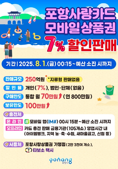 포항시가 지역 소비 활성화를 위해 내달 1일부터 카드형·모바일 포항사랑상품권(이하 포항사랑카드)을 250억 원 규모로 7% 할인된 가격에 판매한다.